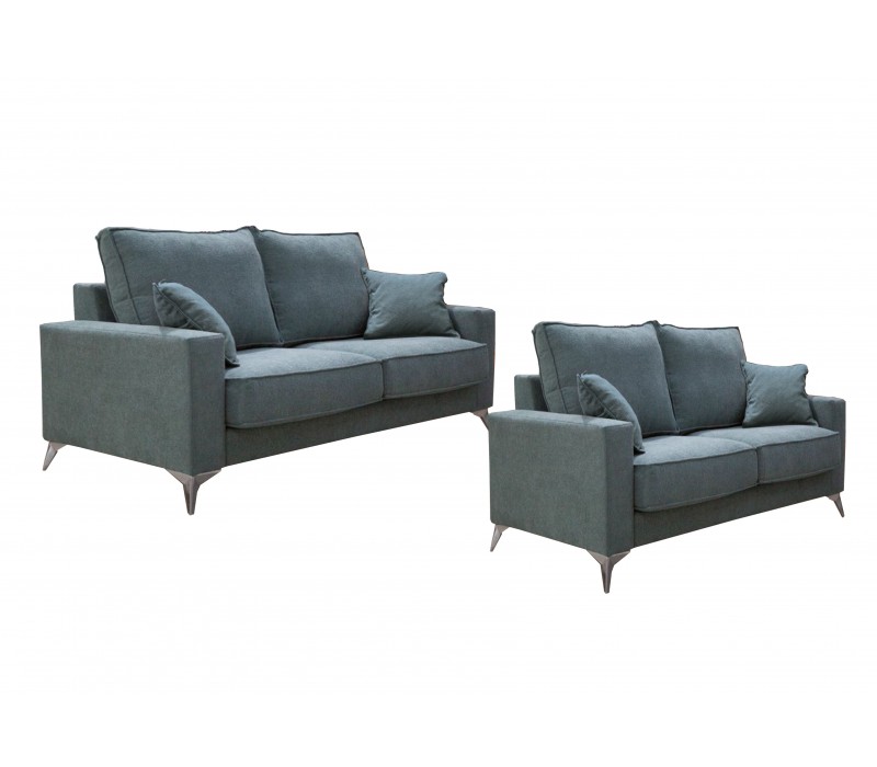 Este conjunto sofá 3+2 tiene respaldo y asiento fijo, 100% fibra hueca siliconada. Sus respaldos y asientos son desenfundables. Sus asientos son de densidad 30 kg. con una gran adaptabilidad. Su armazón es de madera de pino macizo. Tiene suspensión de asiento con cincha de Nea. Sus patas altas metálicas están disponible en negro, blanco e inox con una altura 13 cm.