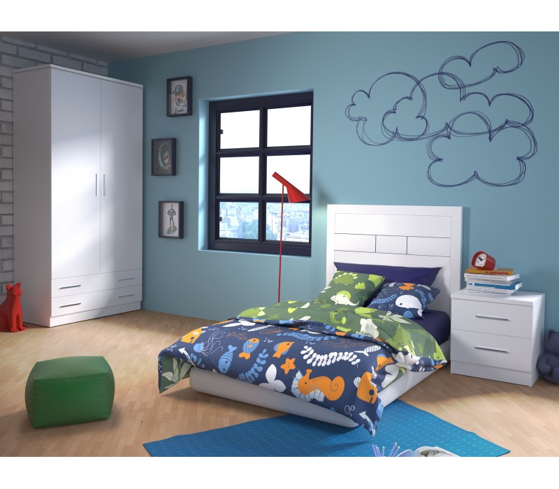 Dormitorio juvenil compuesto por cabecero, mesita de noche y armario 2 puertas. Este cabecero sirve tanto para cama de 90 cm como para cama de 105 cm.