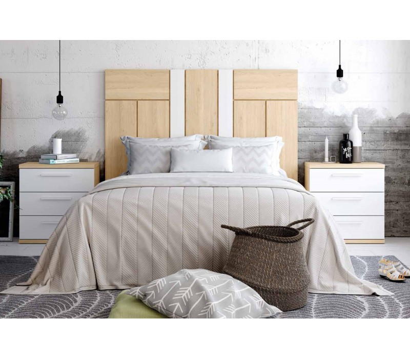 Se trata de un dormitorio que nos aporta elegancia y al mismo tiempo sencillez. Está formado por un cabecero alto con plafones y dos mesita noche de 3 cajones.