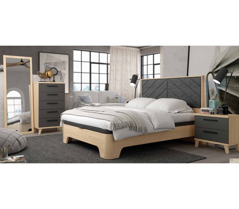 Se trata de un dormitorio que nos aporta elegancia y al mismo tiempo sencillez. Está formado por un cabecero alto tapizado combinado con muebles con patas que le dan un efecto más desenfadado al dormitorio.