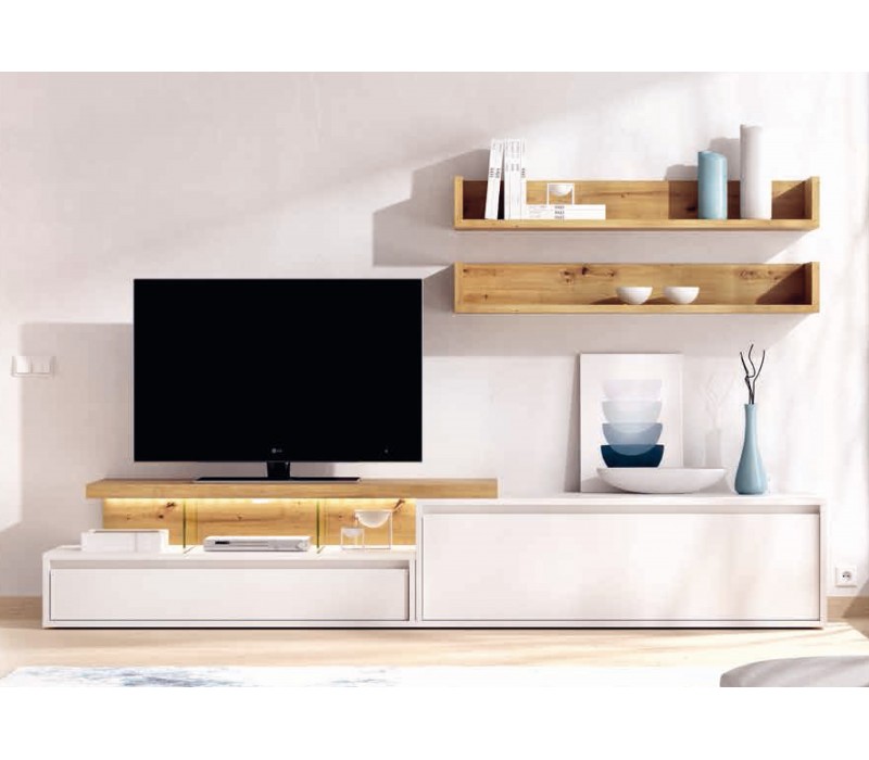 Son muebles fabricados con tablero laminado de primera calidad resistentes a rayaduras y manchas. Con grosor de 1.90 cm y 3 cm. Los cristales son de 6mm para los estantes interiores y 5mm para el cristal estructural de módulos y puertas. Hay la posibilidad de añadir iluminación led.