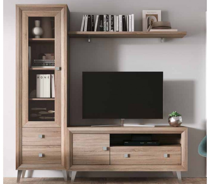 Se trata de una composición de salón con muebles que tienen un toque contemporáneo. En estos muebles destacan sus líneas rectas enfatizadas por un enmarcado con molduras.